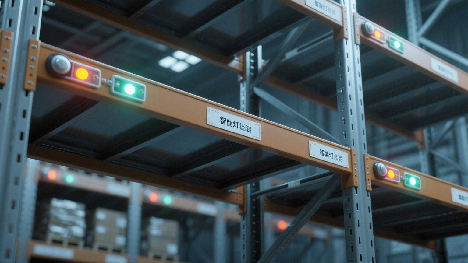 采用固定結構設計,取消復雜可調組件,貨架層橫梁集成聲光指示器,與標簽聯動響應,無需額外電源支持,僅通過簡單 “亮 / 滅” 狀態傳遞定位信息。從圖 2 智能貨架示意圖中,能清晰看到每層橫梁上的聲光指示器布局 。